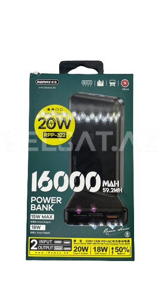 Remax RPP-322 20W 16000mAh Güc Bankası, cihazlarınızı daima enerji ilə təmin etmək üçün əla bir seçimdir. Taşınması asan və praktik dizaynı ilə gündəlik həyatınızda rahatlıqla istifadə edə bilərsiniz.